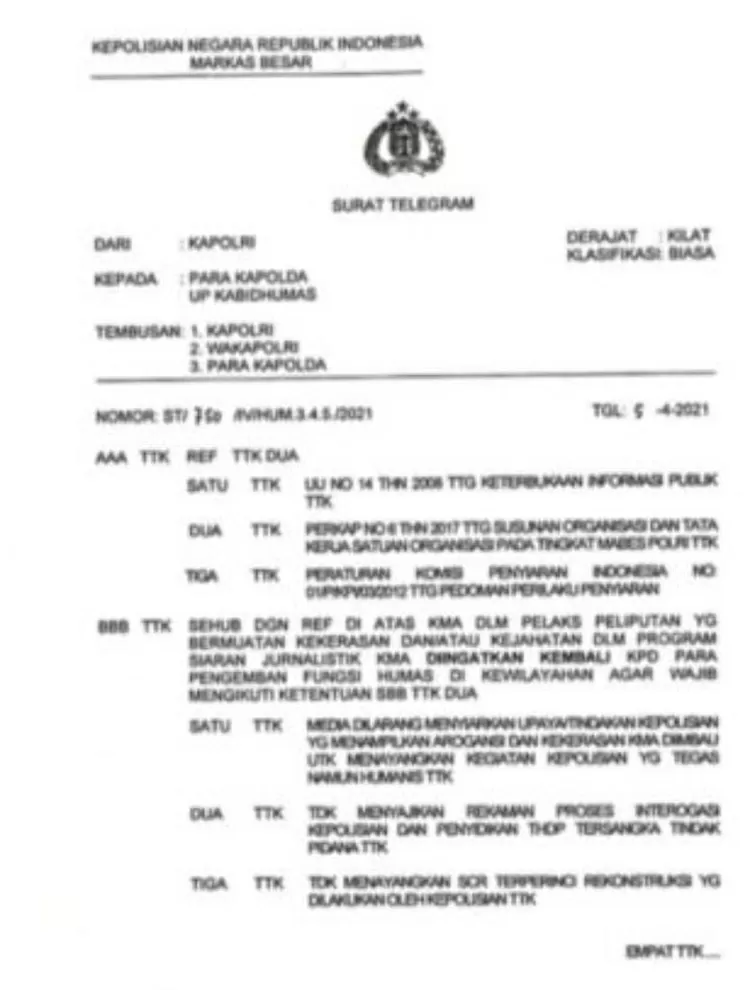 Seperti diketahui, Kapolri sempat menerbitkan surat telegram (ST) terkait soal pelarangan media menyiarkan arogansi anggota polisi, meskipun akhirnya ST tersebut dicabut pada Selasa (6/4).
