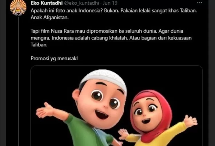 Eko mengkritik pakaian yang dikenakan dalam karakter animasi itu yang disebut mirip Taliban. Ia membagikan foto animasi dua karakter film, yakni Nussa dan Rara.