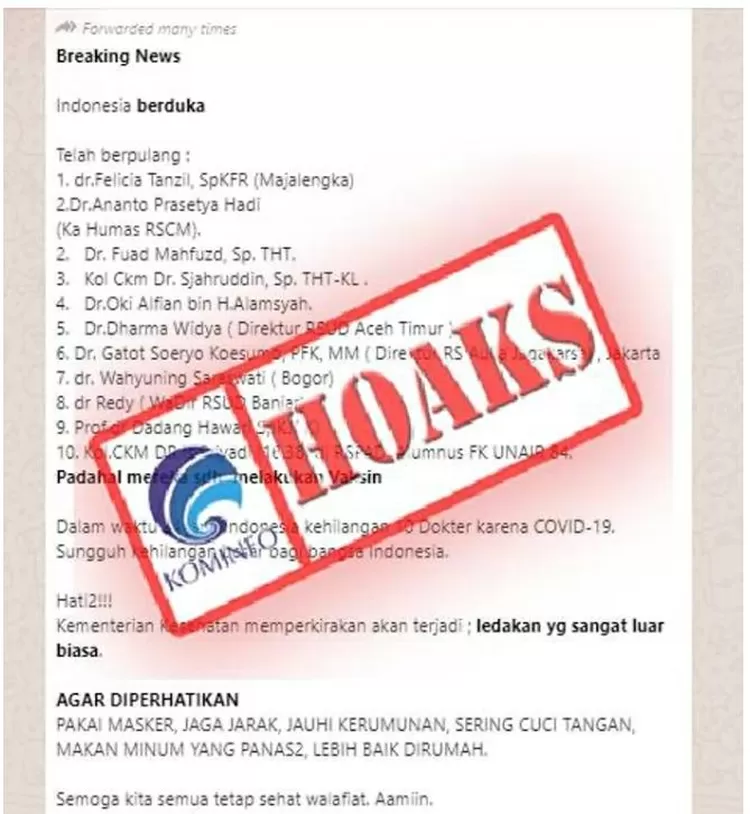 JAKARTA, klikaktual.com - Informasi meninggalnya 10 dokter karena Covid-19 dalam waktu 24 jam, viral dan beredar luas melalui Broadcast WhatsApp. Padahal, mereka sudah vaksin sebelumnya.