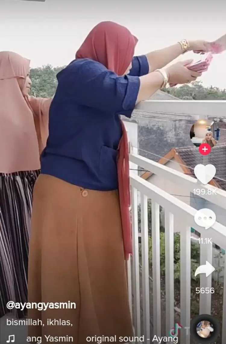 Video yang diunggah akun TikTok @ayangyasmin, Senin (22/3/2021), telah ditonton 5,1 juta kali. Dalam video itu, sebelum membagikan uang, seorang perempuan meminta orang-orang yang berada di bawah balkon untuk bersiap-siap. Sontak, orang-orang yang di bawah siaga. Lalu berebut tiap kali si pemilik menebar uang dari atas.