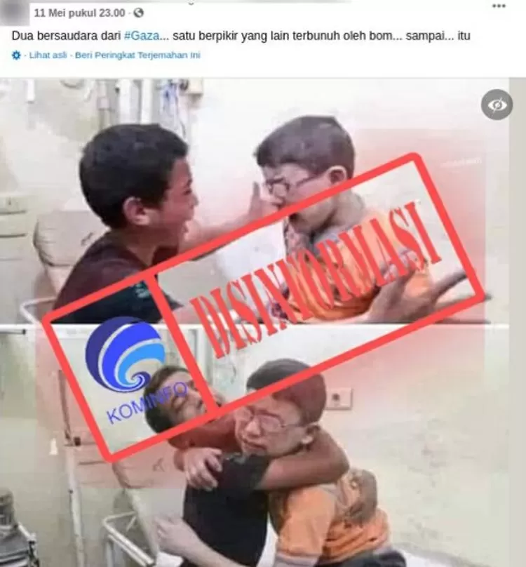 Faktanya, seperti dilansir kominfo.go.id, klaim foto yang memperlihatkan dua anak laki-laki di Gaza yang sedang menangis sambil berpelukan adalah keliru. Foto kedua anak laki-laki tersebut telah beredar sejak tahun 2016 saat serangan bom di kota Aleppo, Suriah. (gna)
